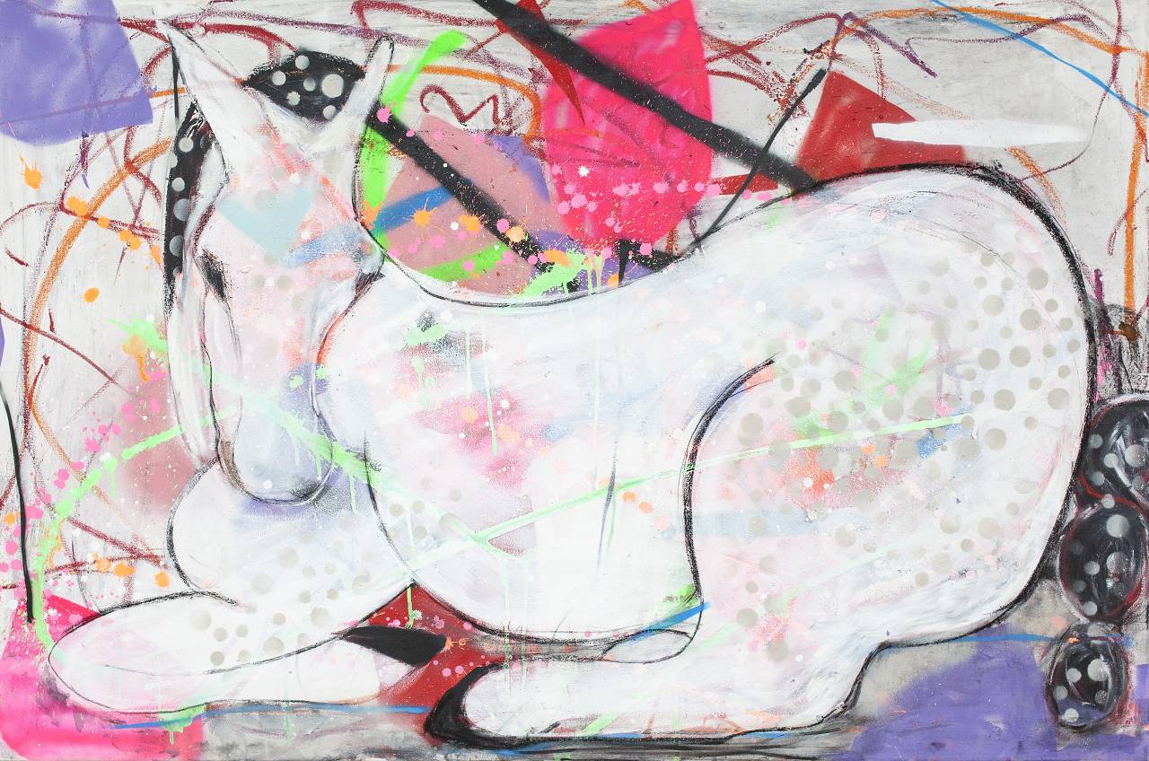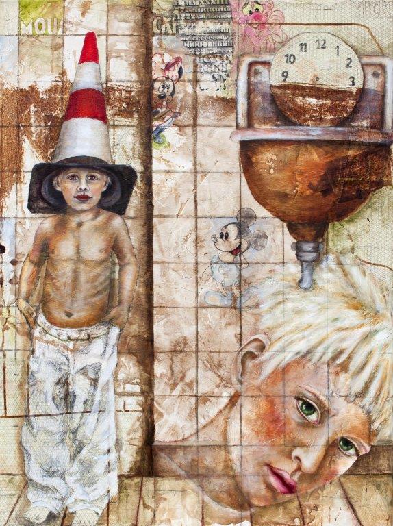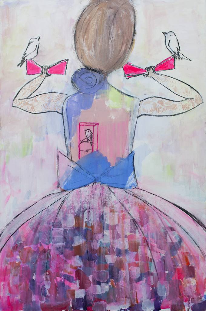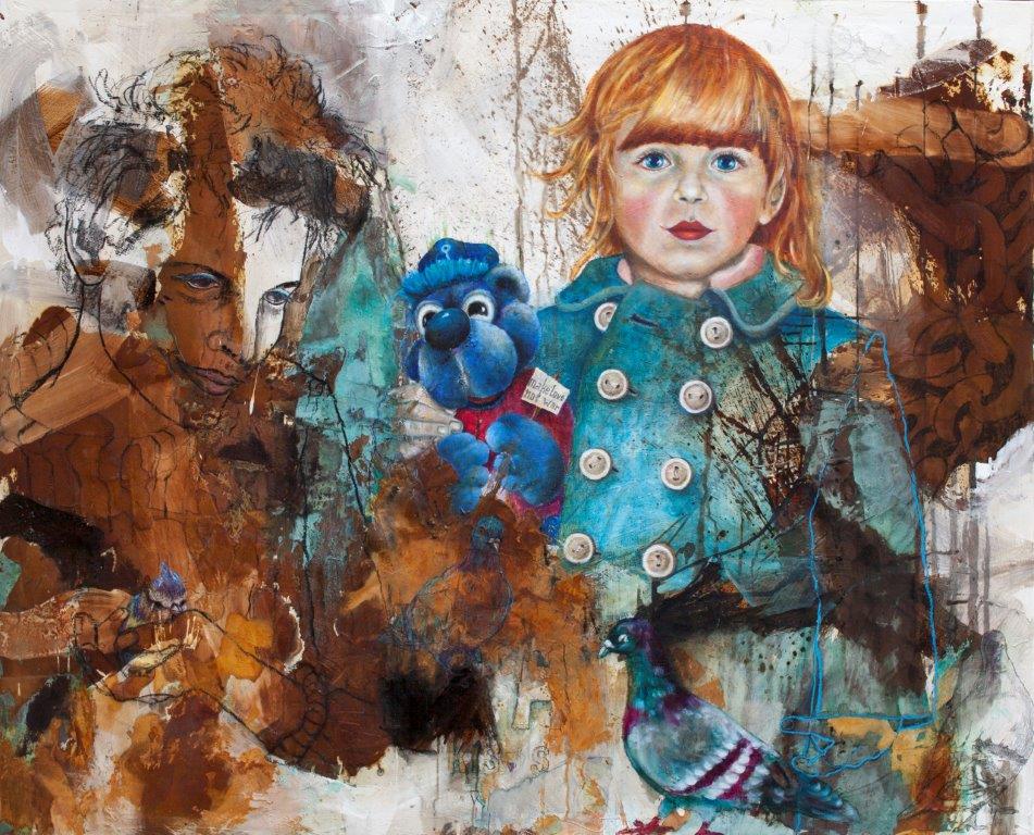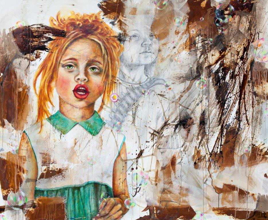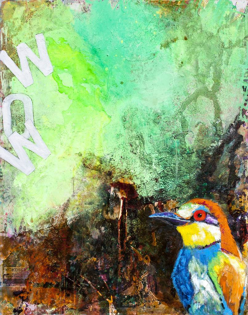 Dazu gesellen sich nach eigener Aussage dann die erkennbaren realistischen Motive. Dieser Mix an Techniken und Ausdrucksweisen ist kennzeichnend für die Werke von Birgit Lorenz. „Es kann sein, dass auf einem Bild Zeichnungen und Malerei zusammen mit strukturierten Flächen, satt hingeworfenen Farbflecken und Lasuren aus einem Eimer Farbe zusammenspielen“. Auch Collage-Elemente gibt es oft irgendwo kaum wahrnehmbar zu entdecken. Gleiches gilt für Graffiti-Sprüche oder versteckte Drucktechniken. Es sind einfach immer sehr viele Ideen, die aus ihrem Kopf „purzeln“ und sich wiederfinden wollen, wie sie selbst sagt.